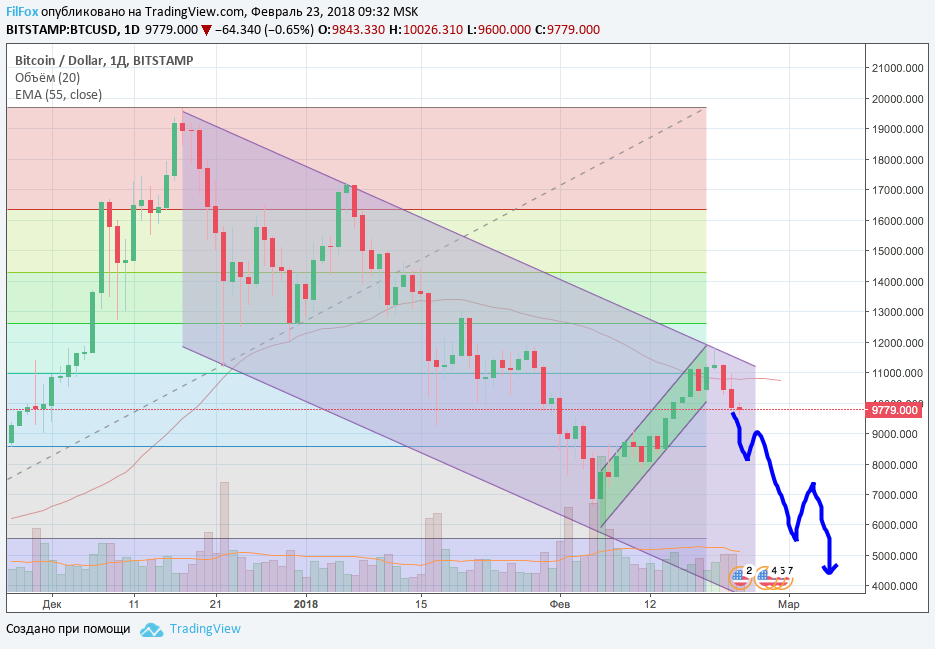 Если же взглянуть на дневной тайм-фрейм, то можно заметить, что рост цены Bitcoin, который начался 6 февраля от минимума 5 920.00 USD и достиг максимума на отметке 11 780.00 USD, проходил в рамках нисходящего фиолетового коридора, и является коррекцией нисходящего тренда, который начался 17 декабря 2017 года, падением Bitcoin с вершины, примерно 20 000.00 USD. В этом случае цена на Bitcoin упадёт ниже предыдущего минимума 5 920.00 USD.