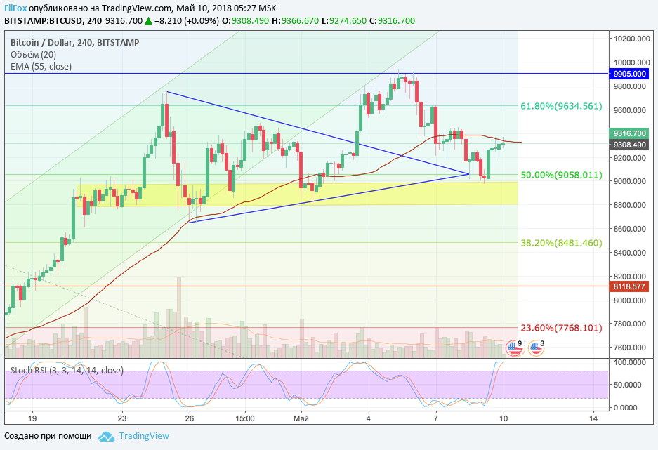 Если паре удасться каким-то образом консолидироваться на уровне средних цен и закрепиться чуть выше скользящей средней EMA55, то рост к уровню 61.8% фибо (9634.00 USD) - продолжится. Иначе - сегодня повторится откат к уровню 50% фибо (9058.00 USD).