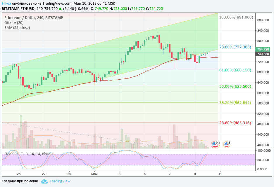 Вчера, после дневного минимума на отметке 710.00 USD, цена Ethereum восстановилась к нижней границе зелёного коридора роста. Но преодолеть её и войти зелёную зону коридора, эфиру так и не удалось. Если сегодня объёмы торгов будут такими же маленькими, как и вчера, то цена продолжит движение в боковом диапазоне и уровень средних цен EMA55 будет удерживать пару ETH/USD от снижения.