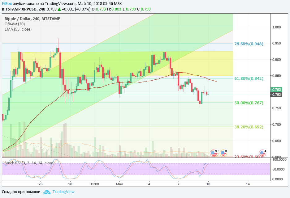 Несмотря на малый объём торгов, цена Ripple вчера протестировала на снижении уровень 50% фибо (0.767 USD) и установив дневной минимум на отметке 0.755 USD, восстановилась в область цен 0.800 USD за рипл. Полагаем, что на сегодня наиболее вероятным сценарием выглядит повторный ре-тест уровня поддержки 50% фибо (0.767 USD). В случае прорыва этого уровня, цена попробует закрепиться под ним в кратковременной консолидации.