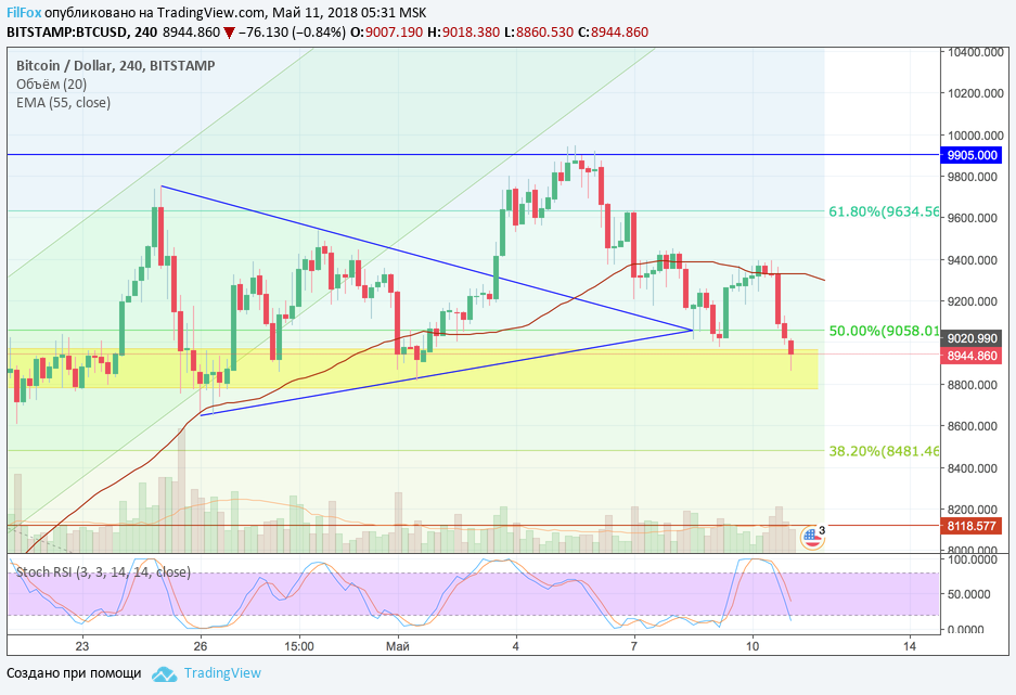 Как я вчера и предупреждал, цена Bitcoin не смогла закрепить свои позиции на уровне скользящей средней EMA55 и откатилась к уровню 50% фибо (9058.00 USD). Сегодня Bitcoin пробил этот уровень поддержки и продолжил падение. Этот тревожный сигнал можно воспринимать как отказ от повторных попыток в ближайшем будущем штурмовать высоту «Десять тысяч долларов».