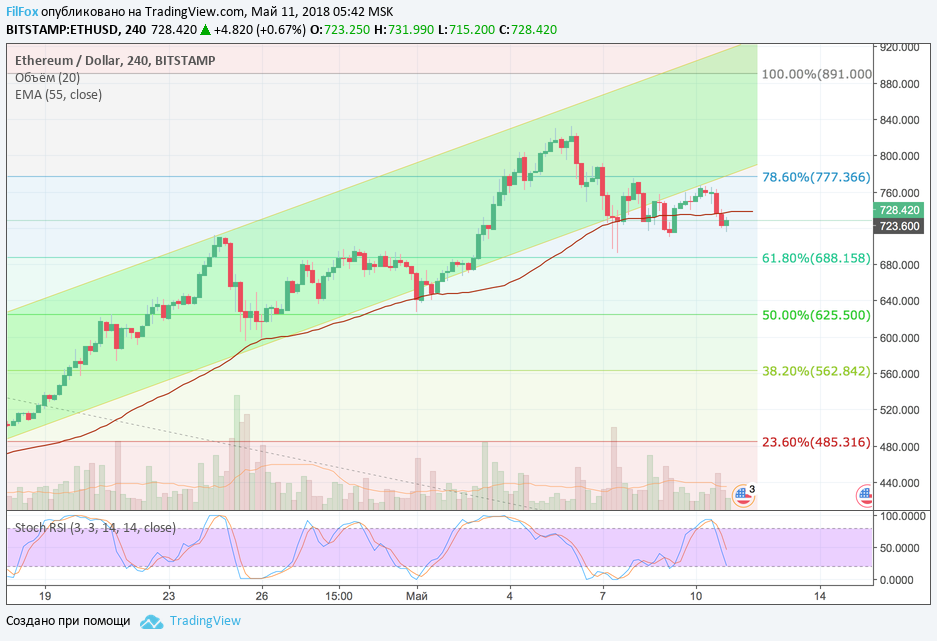 Сегодня цена пробила поддержку скользящей средней EMA55 и продолжила снижение. Возможно, что сегодня днём, эфир задержится в районе средних цен, но вскоре нас ожидает ре-тест уровня поддержки 61.8% фибо (688.16 USD).
