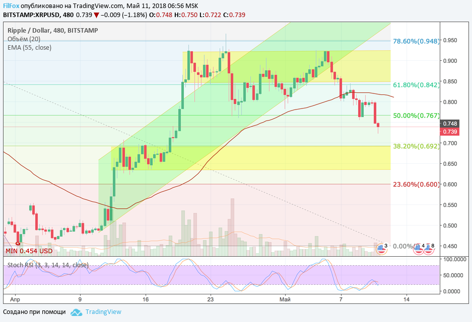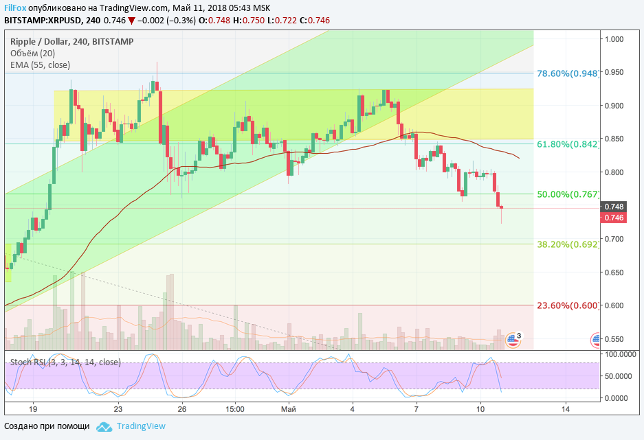 Вчера после непродолжительной консолидации в области цен 0.800 USD, цена Ripple ожидаемо протестировала уровень 50% фибо (0.767 USD).