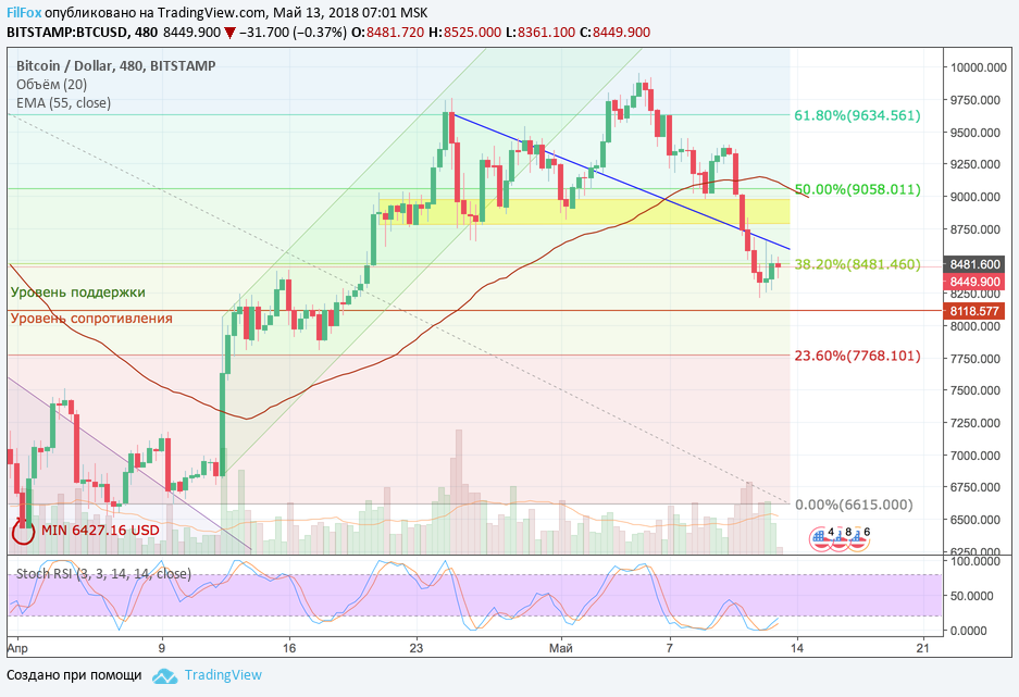 В понедельник и во вторник динамика пары BTC/USD демонстрировала технический откат и консолидацию, а на 9 мая, когда рост цены ослаб и проходил на объёмах ниже средних, стало ясно - быки выдохлись! Десятого мая после откровенно «притянутого за уши» максимума 9 393.00 USD, курс Bitcoin начал катастрофически обрушиваться. Это результат очередной волны распродаж остатков обанкротившейся биржи Mt. Gox. Управляющий банкротством, в конце апреля, вывел из холодного хранения около 16 тысяч BTC для погашения кредиторской задолженности. В итоге продажи, примерно половины этой суммы, цена Bitcoin установила вчера недельный минимум на отметке 8 208.00 USD.