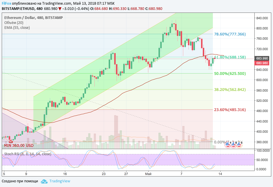 Ethereum после недельного максимума 10 мая, на отметке 767.00 USD, который, кстати, тоже был установлен на мизерных объёмах, увлекаемый распродажами криптовалютного флагмана BTC, вступил в стадию технического отката. Цена смогла «зацепиться» за уровень поддержки 61.8% фибоначчи (688.16 USD) и несмотря на попытки медведей продавить ниже - эфир обозначил недельный минимум 638.00 USD, после чего «гордо вернулся» к поддержке 61.8% фибо. Мы уже отмечали, что падение пары ETH/USD было менее динамичным, чем BTC/USD и приостановилось в области средний цен, обозначенной EMA55 на восьмичасовом тайм-фрэйме.