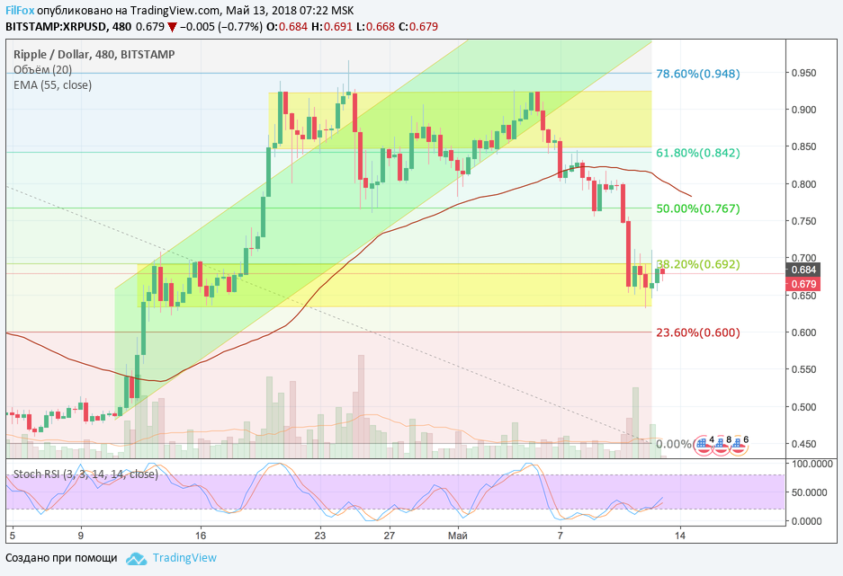 Ripple, в отличии от Ethereum, напротив, не пытался долго сопротивляться и от уровня средних цен камнем рухнул в желтую область консолидации, пробив во время падения сразу два уровня поддержки фибоначчи. Сейчас цена на рипл консолидируется именно в этом желтом диапазоне, попеременно проверяя на прочность её верхнюю и нижнюю границу. Если начнётся вторая волна распродаж, то цена XRP очень скоро достигнет уровня 23.6% фибо (0.600 USD)