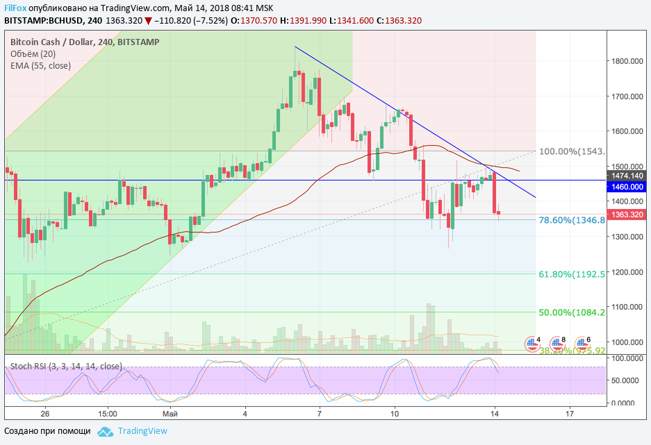 В субботу BCH встретил поддержку на уровне 78.6% фибо (1346.80 USD) и в воскресенье восстановился до уровня средних цен. Пробить синюю трендовую линию сопротивления не получилось и сегодня цена вновь вернулась на исходный уровень 78.6% фибо (1346.80 USD)