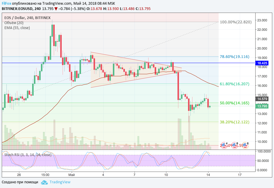 На выходных цена на токен EOS тестировала уровень фибоначчи 50% (14.16 USD). В субботу, снизу, пытаясь его преодолеть, а в воскресенье сверху, пытаясь установить дневной максимум. В итоге максимум был зафиксирован в точке 15.125 USD, после чего пара EOS/USD пробила поддержку 50% фибо (14.16 USD) и сейчас подвисла в районе цен 13.5 USD.