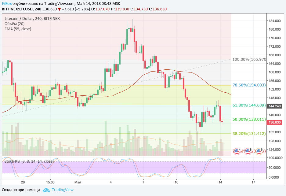 В пятницу вечером цена Litecoin не смогла удержаться в желтом коридоре и увлекаемая падением цен основных криптовалютных пар из первой тройки тоже снижалась, пока не встретила поддержку на уровне 38.2% фибо (131.41 USD). Основное время на выходных она провела между уровнями фибоначчи 50% (138.00 USD) и 61.8% (144.60 USD). Вчера стохастик подал сигнал на снижение цены и сейчас цена LTC пробила 50% фибо и велика вероятность ре-теста 38.2% фибо (131.41 USD).