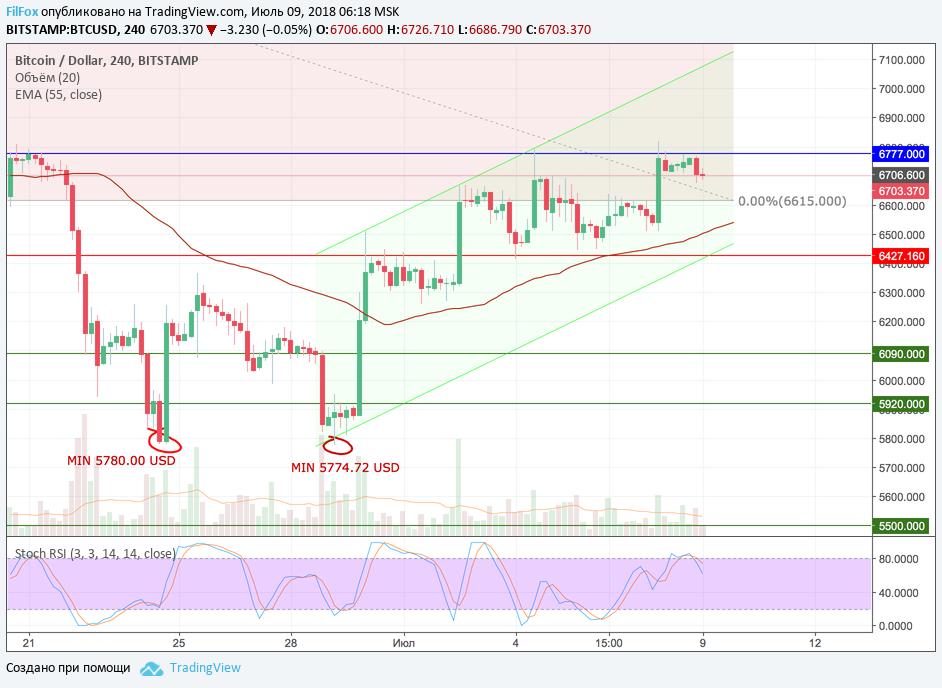 За минувшие выходные Bitcoin так и не смог закрепиться выше уровня 6777.00 USD. В воскресенье цена несколько раз касалась этого ключевого сопротивления, но в итоге откатилась к дневному минимуму 6674.00 USD.