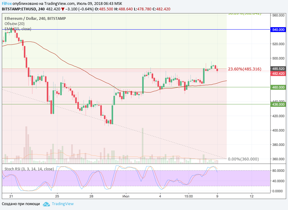 Вчера Ethereum на подходе к отметке 500.00 USD, установил локальный максимум в точке 495.00 USD. После этого стохастик нарисовал сигнал на снижение. Цена откатилась ниже уровня фибоначчи 23.6% (485.31 USD) и продолжает снижаться. Полагаем, что сегодня глубина отката не превысит уровень средних цен, а попытки закрепиться выше сопротивления 23.6% фибо (485.31 USD) возобновятся.