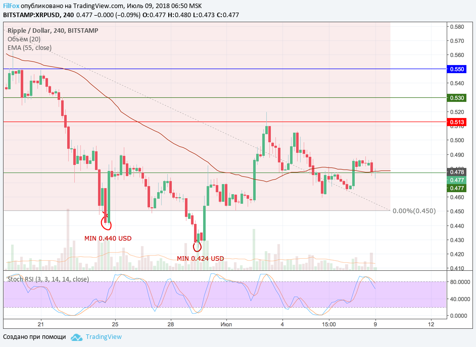 Ripple на выходных находился выше скользящей средней EMA55, но вчера во второй половине дня цена вновь вернулась на уровень средних цен 0.477 USD. Судя по показаниям стохастика, сегодня снижение в пределах боковика, будет продолжаться и, скорее всего, ограничится уровнем 0.462 USD. Если медвежье давление усилится, то рипл сможет воспользоваться поддержкой нулевого уровня фибоначчи 0.450 USD.