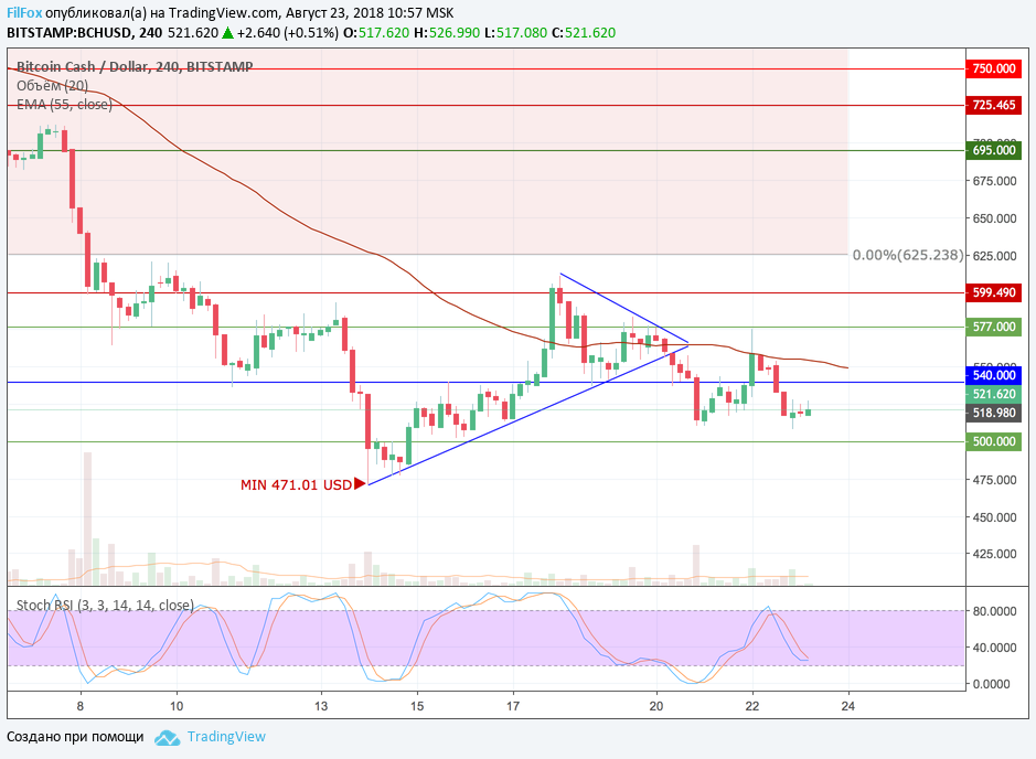 Фундаментальная новость об отказе SEC по ETF-заявке ProShares не выбила рынок из бокового диапазона. Поскольку вероятность отказа SEC была очень высока, участники рынка довольно сдержано отреагировали на очередной провал. Цена Bitcoin Cash в пределах боковика просела в область 515 долларов за монету и пытается консолидироваться на этом уровне. Стохастик на границе нейтральной зоны формирует сигнал на рост. Полагаем, что сегодня пара вернётся к уровню средних цен, продолжая двигаться во флэте.