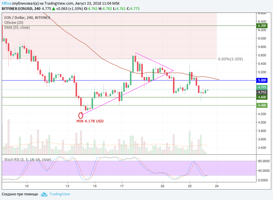 Вчерашний день закрылся котировками EOS в области 4.70 USD. Сегодня боковое движение продолжится. Внутри боковика цена пары восстановится к скользящей средней EMA55, которая проходит на уровне пяти долларов за монету. Любителям заработать на торговле во флэте, можно продавать от уровня 5.00 USD с целью снижения к поддержке 4.40 USD.