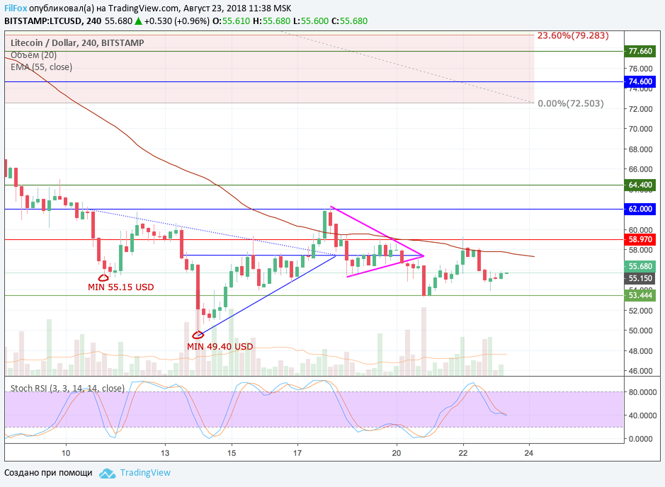 Вчера во второй половине дня цена Litecoin снижалась к поддержке 53.44 USD. Оставаясь в пределах боковика пара начала сужать амплитуду колебания и сейчас разброс цен ограничивается сопротивлением скользящей средней EMA55 и поддержкой 53.44 USD. Если поддержка не выдержит очередного ре-теста, то пара обновит годовой минимум до уровня 47.92 USD.