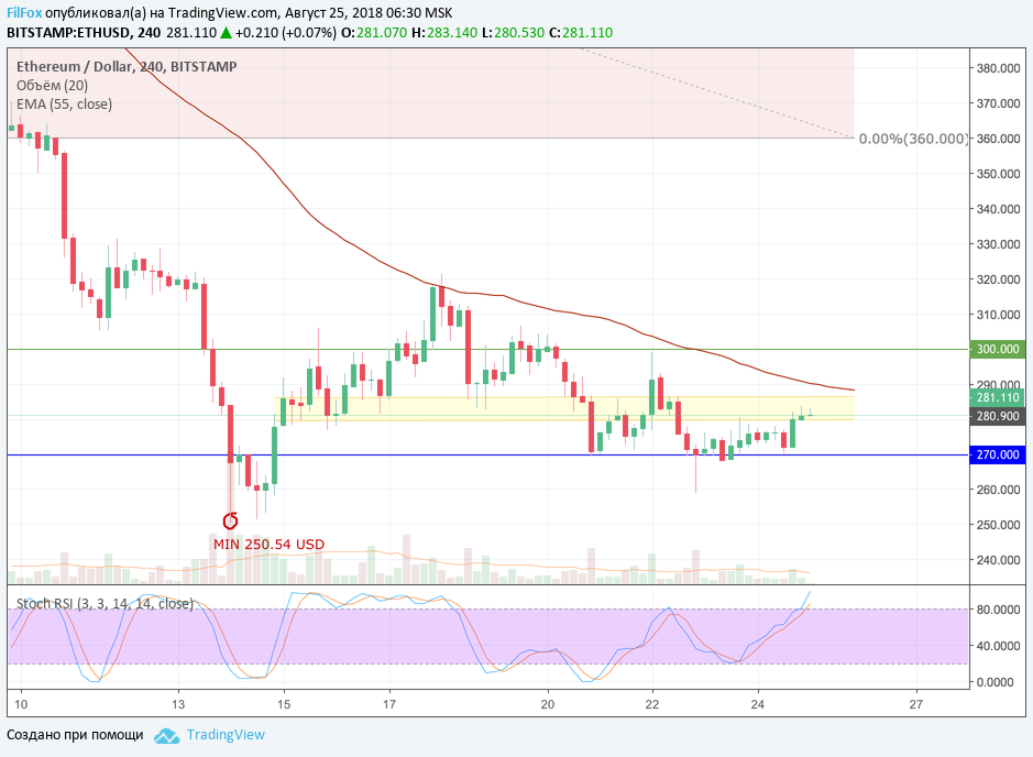 Полагаем, что сегодня Ethereum продолжит консолидацию в нижней части бокового диапазона, между поддержкой 270.00 USD и желтой областью сопротивления. Вчерашний прогноз по выходу эфира из диапазона консолидации по-прежнему актуальный. Вероятность снижения к очередному минимуму превышает шансы на прорыв к нулевому уровню фибоначчи.