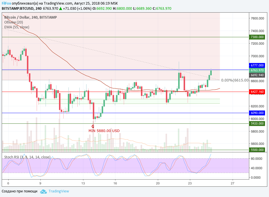 Сегодня ночью цена прорвала нулевой уровень фибоначчи 6615.00 USD и протестировала сопротивление 6777.00 USD. Цены максимума торговались на снижающихся объёмах. Скорее всего это сопротивление развернёт BTC на снижение в пределы боковика, к уровню средних цен, а в завершении дня нас ждёт ре-тест зелёной области поддержки.