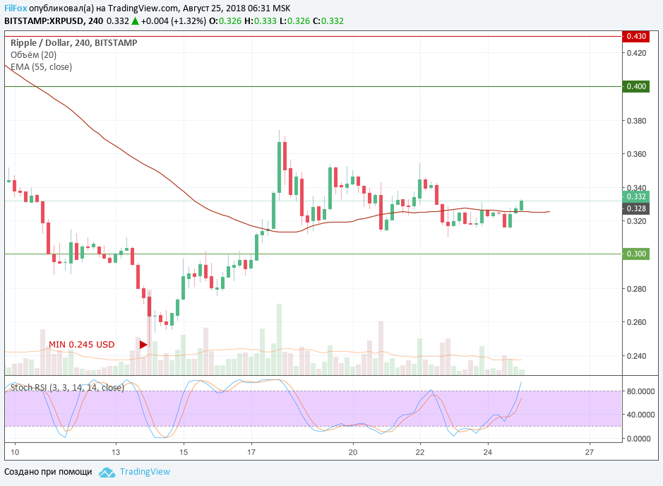 Ripple ещё больше сузил диапазон консолидации, сместившись чуть выше скользящей средней EMA55. В течение дня возможен откат к нижней границе боковика 0.300 USD. Выход из флэта в область годового минимума, по вчерашнему прогнозу, остаётся в силе.