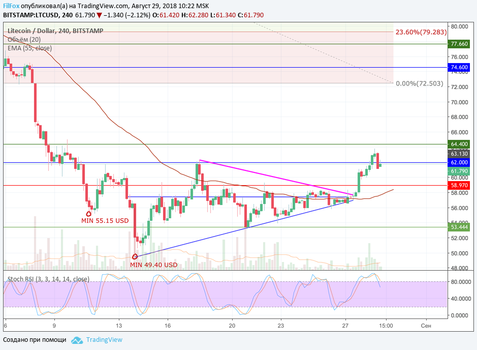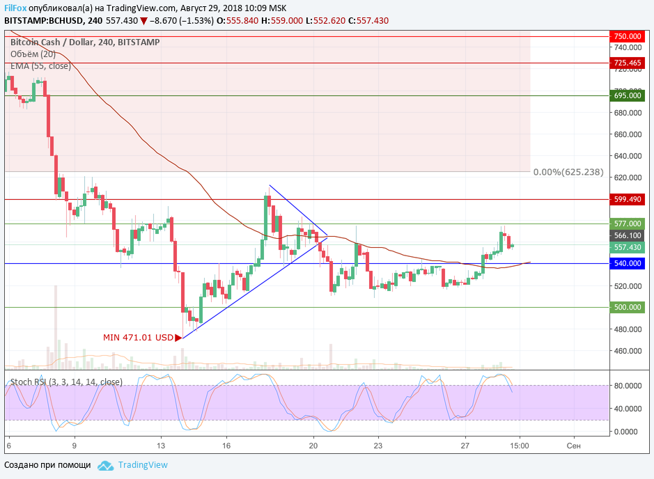 Вчера цена Bitcoin Cash вплотную подошла к сопротивлению 577.00 USD и откатилась от максимума 575.00 USD, так и не протестировав этот уровень. Полагаем, что сегодня из области 555 долларов за монету, пара могла бы продолжить свой рост, но стохастик указывает на предстоящее снижение цены. Возможно, рост возобновится после отката к поддержке 540.00 USD.