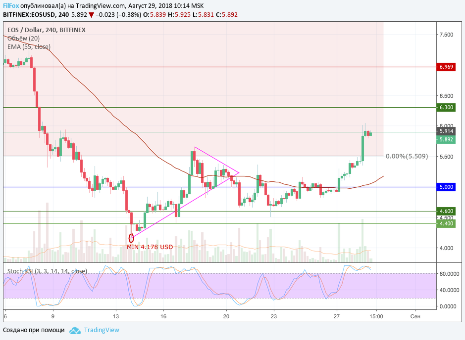 EOS вчера демонстрировал уверенную позитивную динамику и полностью реализовал прогноз по прорыву верхней границы бокового диапазона в виде нулевого уровня фибоначчи (5.509 USD). Рост трансформировался в консолидацию в узком диапазоне $5.80-$5.90. Полагаем, что в этой области цена может нащупать поддержку и продолжит восхождение, чтобы закрепиться выше отметки 6.30 USD. Вполне возможно, что рост утратит вчерашнюю интенсивность и сразу после максимума возле этой отметки, цена может начать откат.