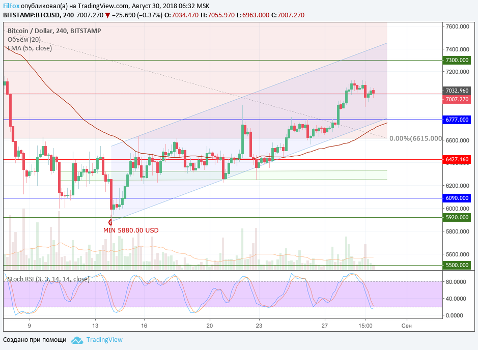 Вчера рост цены Bitcoin был приостановлен, и актив на протяжении дня торговался в диапазоне примерно $6900-$7100. Опять складывается неоднозначная ситуация, в которой вероятность ре-теста верхней границы восходящего коридора примерно равна откату к поддержке 6777.00 USD.