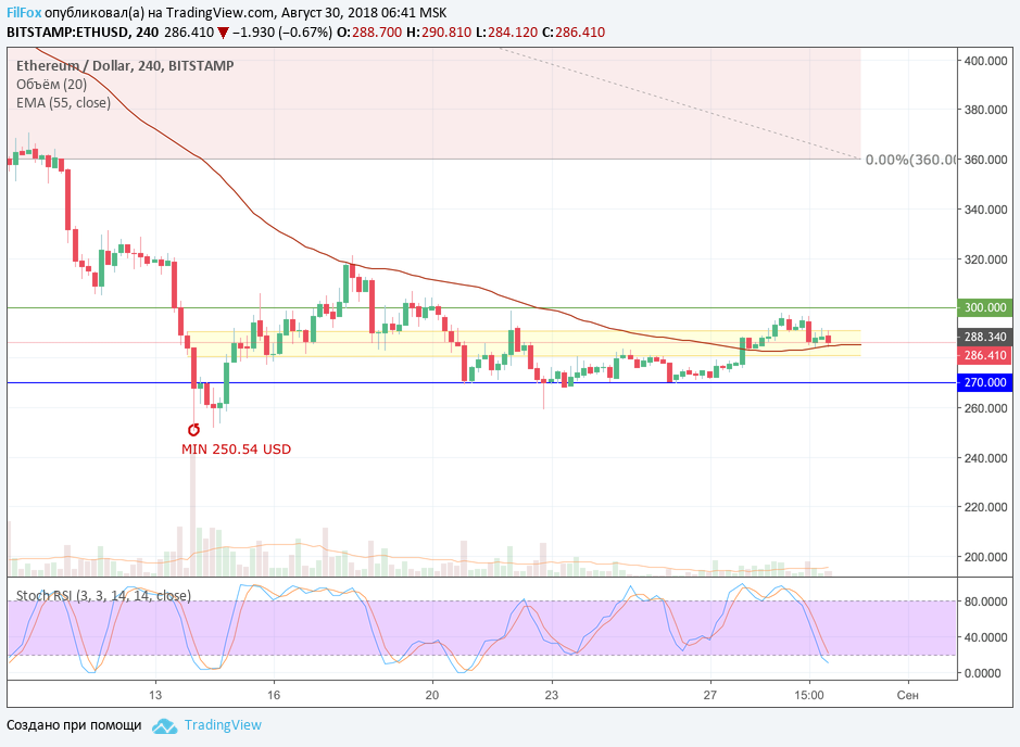Следует отметить, что в то время, пока пара BTC/USD пытается демонстрировать рост в восходящем фиолетовом канале, большинство альткоинов из первого дивизиона CoinMarketCap даже не покидали боковой диапазон, в котором находится цена около трёх недель. Ethereum вчера отказался от ре-теста верхней границы бокового диапазона и откатился в узкий жёлтый коридор, в котором находится уровень средних цен. Возможно, что сегодня скользящая средняя EMA55, окажет поддержку ETH и покупатели смогут добиться ре-теста сопротивления 300.00 USD.