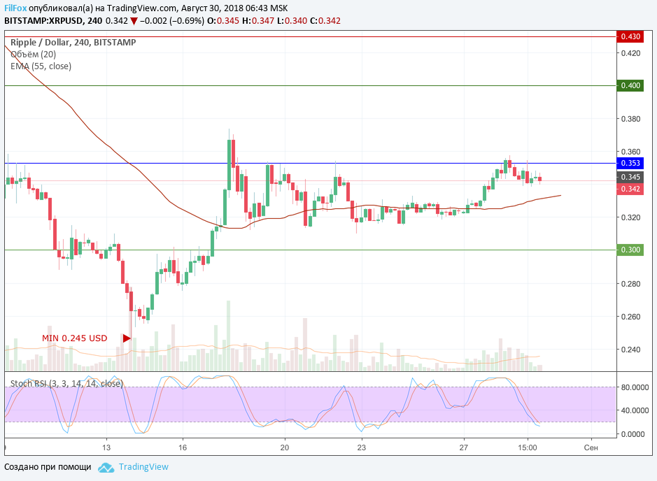 Вчерашний откат в область цен 0.345 USD продолжился консолидацией цены Ripple в узком диапазоне, под уровнем сопротивления 0.353 USD. Один раз за день пара лениво протестировала верхнюю границу боковика и вернулась в свой диапазон консолидации. Сегодня мы ожидаем повторение умеренного роста к верхней границе флэта и рассматриваем возможность закрепления пары над уровнем сопротивления 0.353 USD.