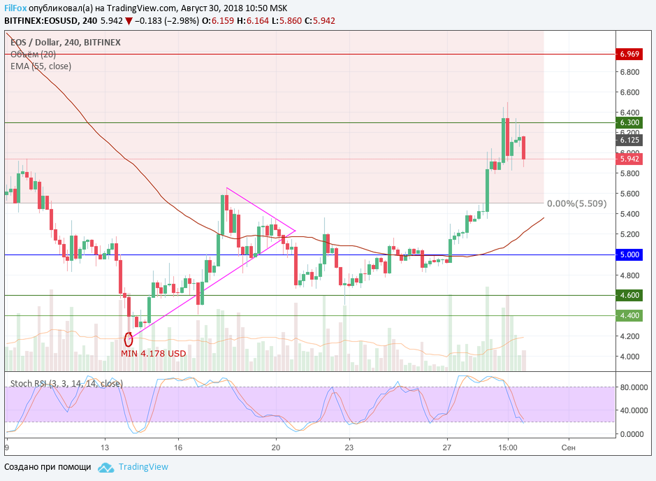 Ре-тест уровня 6.30 USD не дал шансы паре закрепиться выше этого уровня сопротивления. Напомним, что цена EOS на позитивных фундаментальных событиях демонстрировала уверенный рост и смогла вырваться за пределы широкого трёхнедельного диапазона. Но вчера пара откатилась ниже шести долларового порога. В области 5.920 USD просматривается поддержка, от которой возможны новые попытки проверить на прочность уровень 6.30 USD.