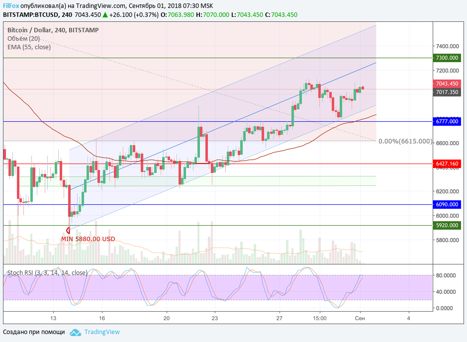 Вчерашняя динамика Bitcoin не выглядела уверенной. Цена так и не смогла преодолеть сопротивление уровня 7100.00 USD. На снижении пара оставалась в пределах коридора роста, а восстановление не было интенсивным, хоть и поддерживалось объёмами покупок выше среднего, протестировать среднюю линию фиолетового коридора не получилось. Динамика создавала впечатления затухания роста.