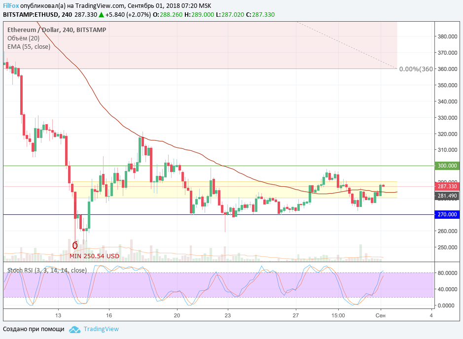 Вчера цена Ethereum консолидировалась в узком желтом коридоре. Амплитуда колебаний сужается к линии скользящей средней EMA55. Сегодня движение в боковике, вдоль уровня средних цен, продолжится.