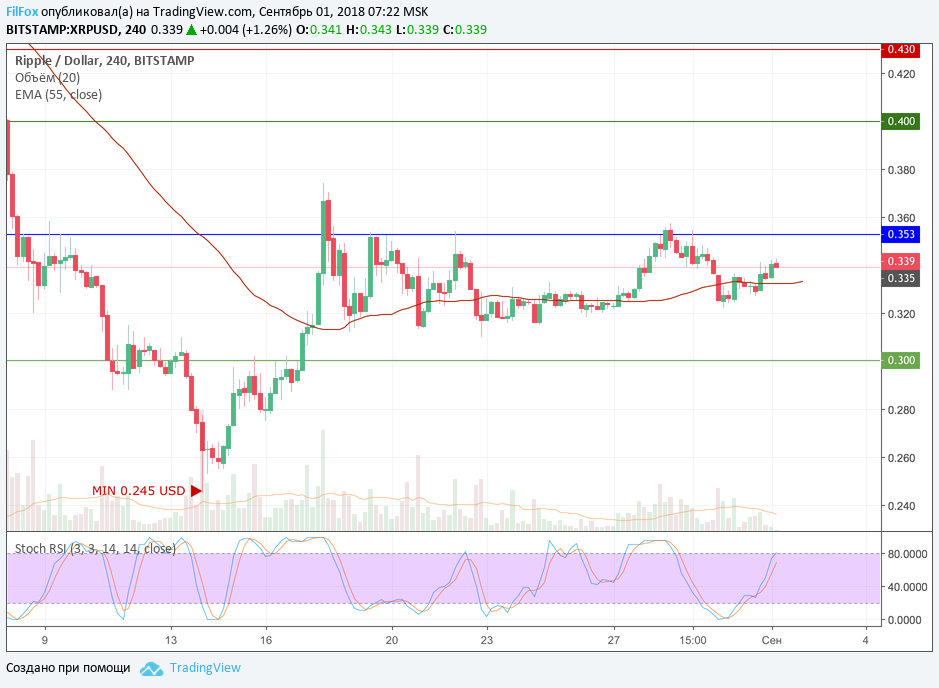 Ripple вчера весь день провёл в узком боковике, незначительно отклоняясь от уровня средних цен. Сегодня дальнейшая консолидация продолжится, цена будет стремиться возвратиться к своему равновесному состоянию 0.333 USD.