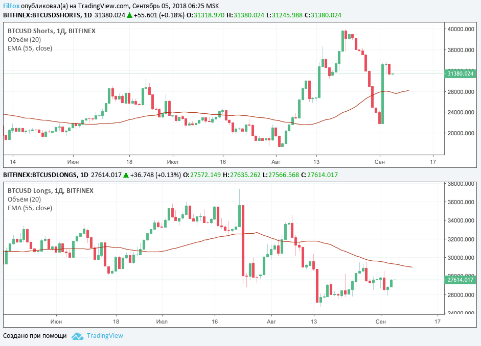Посмотрите на дневные графики маржинальных позиций биржи Bitfinex. Второго сентября количество маржинальных позиций на продажу выросло примерно на десять тысяч, при том, что на вчерашнем росте цены BTC, они сократились всего на две тысячи!