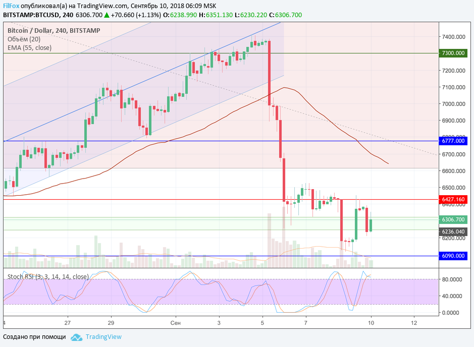 После вчерашнего минимума в точке 6094.38 USD, цена BTC ожидаемо отскочила к сопротивлению на уровне первоапрельского минимума 6427.16 USD. Судя по показаниям стохастика на четырёхчасовом тайм-фрейме, этот уровень развернул цену для снижения в целевую область «шесть тысяч».