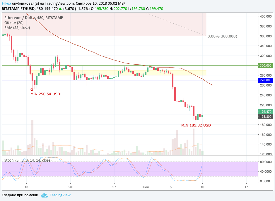 Вчера на снижении пара очередной раз обновила значение годового минимума в точке 185.82 USD, провалившись под психологический уровень 200 долларов за эфир. В течение дня цене ETH удалось восстановиться и консолидироваться под этим психологическим уровнем, но, вероятнее всего, снижение сегодня продолжится, к уровню 180.00 USD, но не будет настолько интенсивным, чтобы пробить его.
