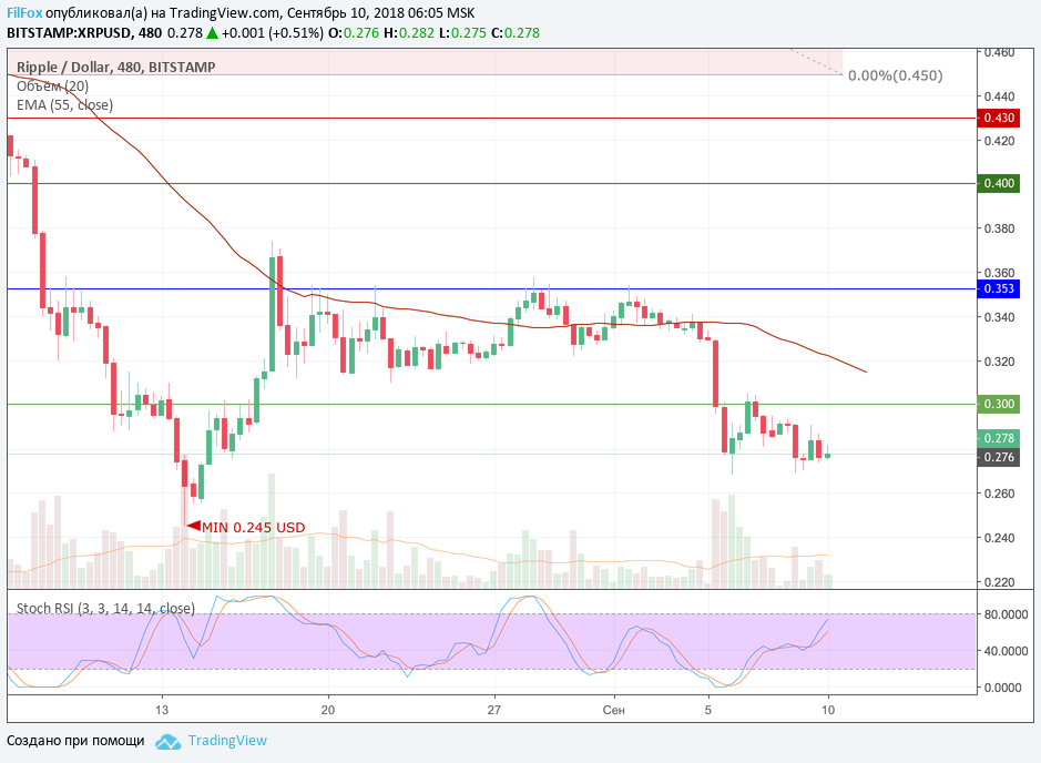 Ripple вчера не смог обновить минимум прошлой недели 0.268 USD. Восстановление началось от отметки 0.269 USD и добралось до уровня 0.291 USD. Сегодня после незначительной консолидации в этом диапазоне продолжится снижение в область 0.260 USD.