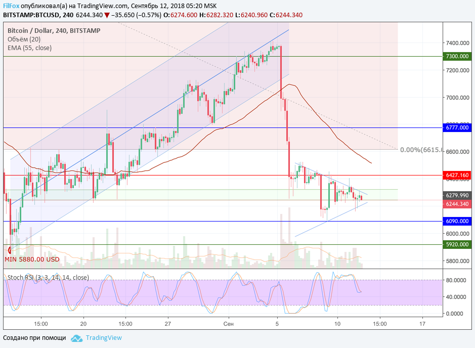 Вчера, продолжая консолидацию в сужающемся диапазоне, цена BTC протестировала на прочность нижнюю границу вымпела. Объёмы продаж были выше средних, но и этого не хватило медведям, чтобы продавить цену к уровню 6090.00 USD. Вскоре цена вернулась в зелёную зону поддержки. Несмотря на то, что рынок альткоинов снижался, паре BTC/USD удалось удержаться в сужающемся боковике.