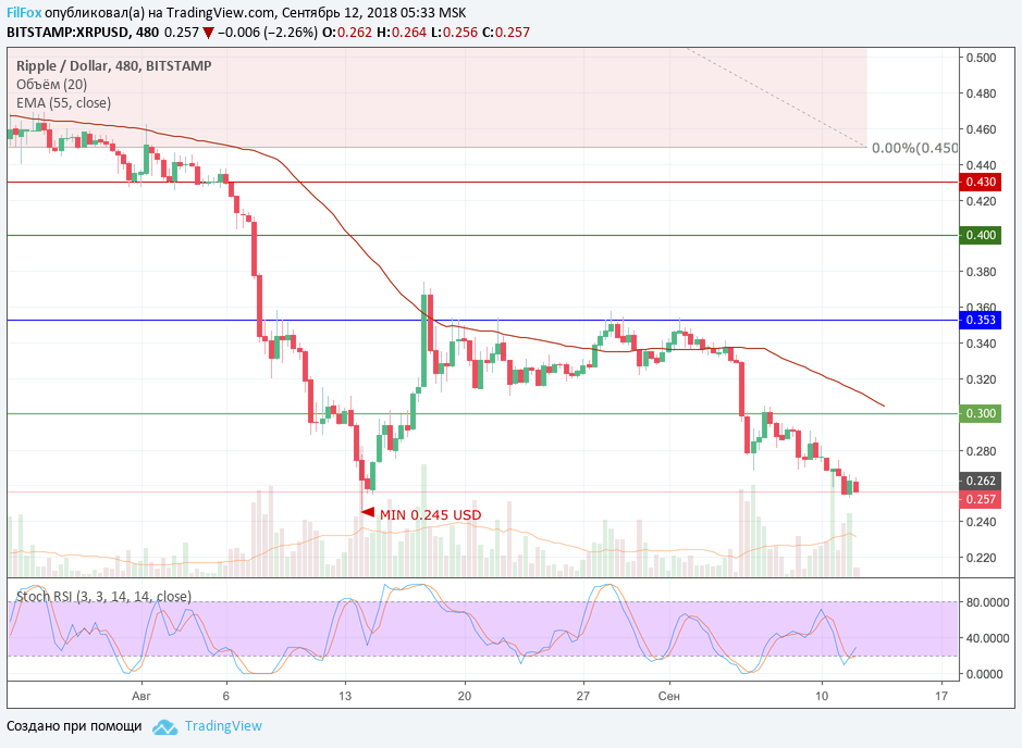 Вчера цена XRP медленно снижалась и установила минимум в точке 0.253 USD. Обновить годовой минимум, установленный в прошлом месяце, пока не удалось. Вчера на минимальных значениях курса, Ripple активно покупали большими объёмами. Это привело к краткосрочному восстановлению цены в область 0.26 USD. Сегодня падение в область годового минимума продолжится.