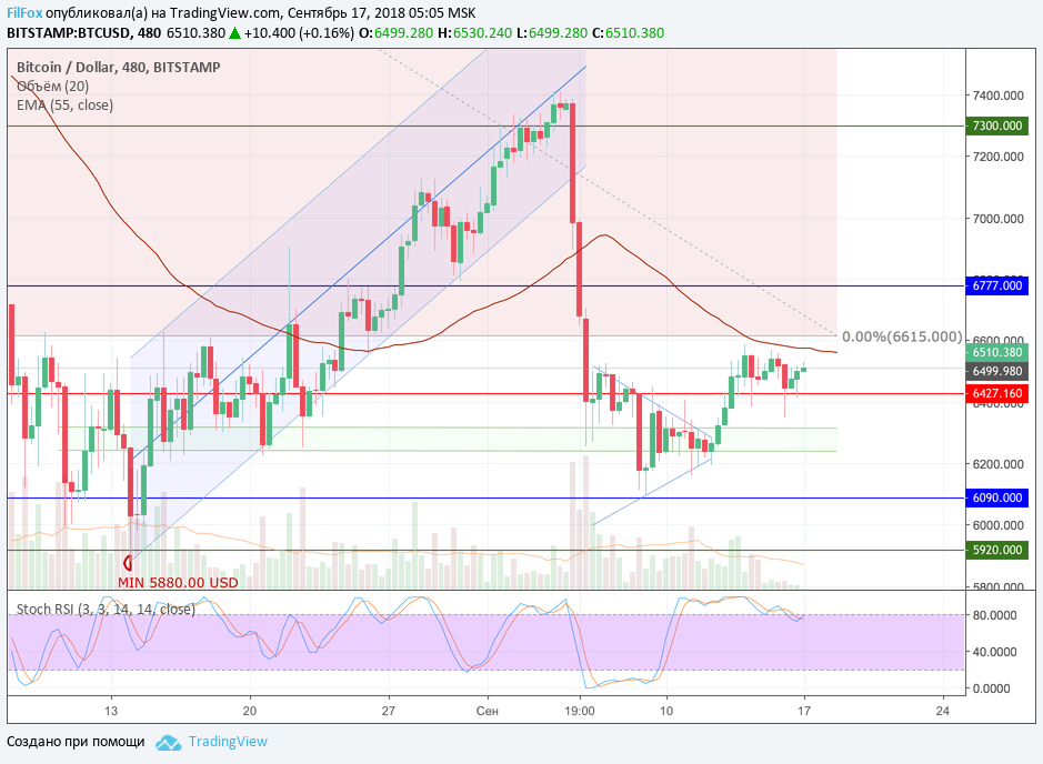 На выходных цена Bitcoin пару раз проколола поддержку 6427.16 USD, но каждый раз предпринимала попытки пробиться выше уровня 6600.00 USD. На таких меленьких объёмах это плохо получается и, пока объёмы будут возле плинтуса, пробиться к нулевому уровню фибоначчи 6615.00 USD, не получится. До появления крупных объёмов цена будет зажата в боковике между поддержкой 6427.16 USD и сопротивлением 6615.00 USD.