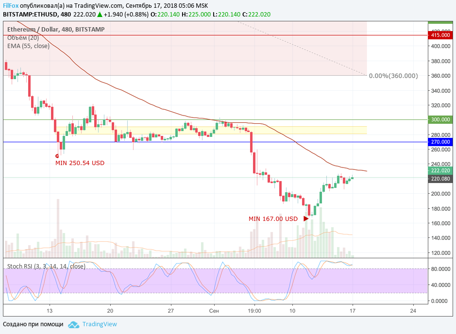 Цена Ethereum зависла в боковом диапазоне. Вплотную подобравшись к скользящей средней EMA55, которая проходит в области 230.00 USD, объёмы торгов резко сократились. Теперь цена бьётся в боковике между EMA55 и психологическим уровнем поддержки 200.00 USD. Пробить сопротивление скользящей средней без участия крупных объёмов будет невозможно.