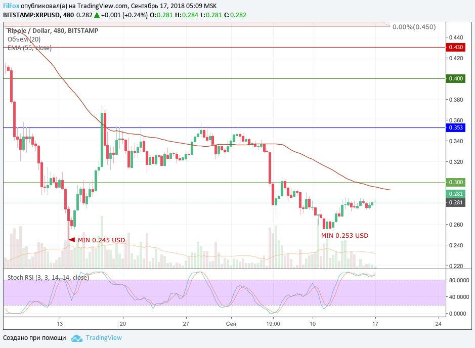 На выходных объёмы торгов по Ripple резко сократились, и цена пары зависла в боковом диапазоне $0.27 - $0.285. В начале недели цена XRP может предпринять попытку пробить сопротивление скользящей средней EMA55, но вряд ли она будет успешной. В отсутствии объёмов рипл продолжит свой боковик, а снижение цены в область 0.260 USD - послужит индикатором возобновления движения в область годового минимума.