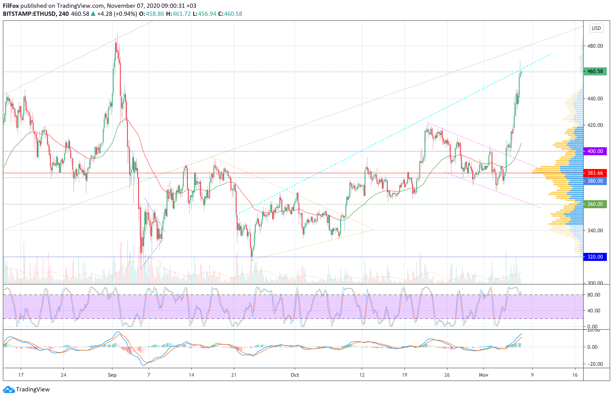 Вчера, в течение дня, цена эфира обновила недельный максимум в точке 447.00 USD и до вечера приостановила рост.