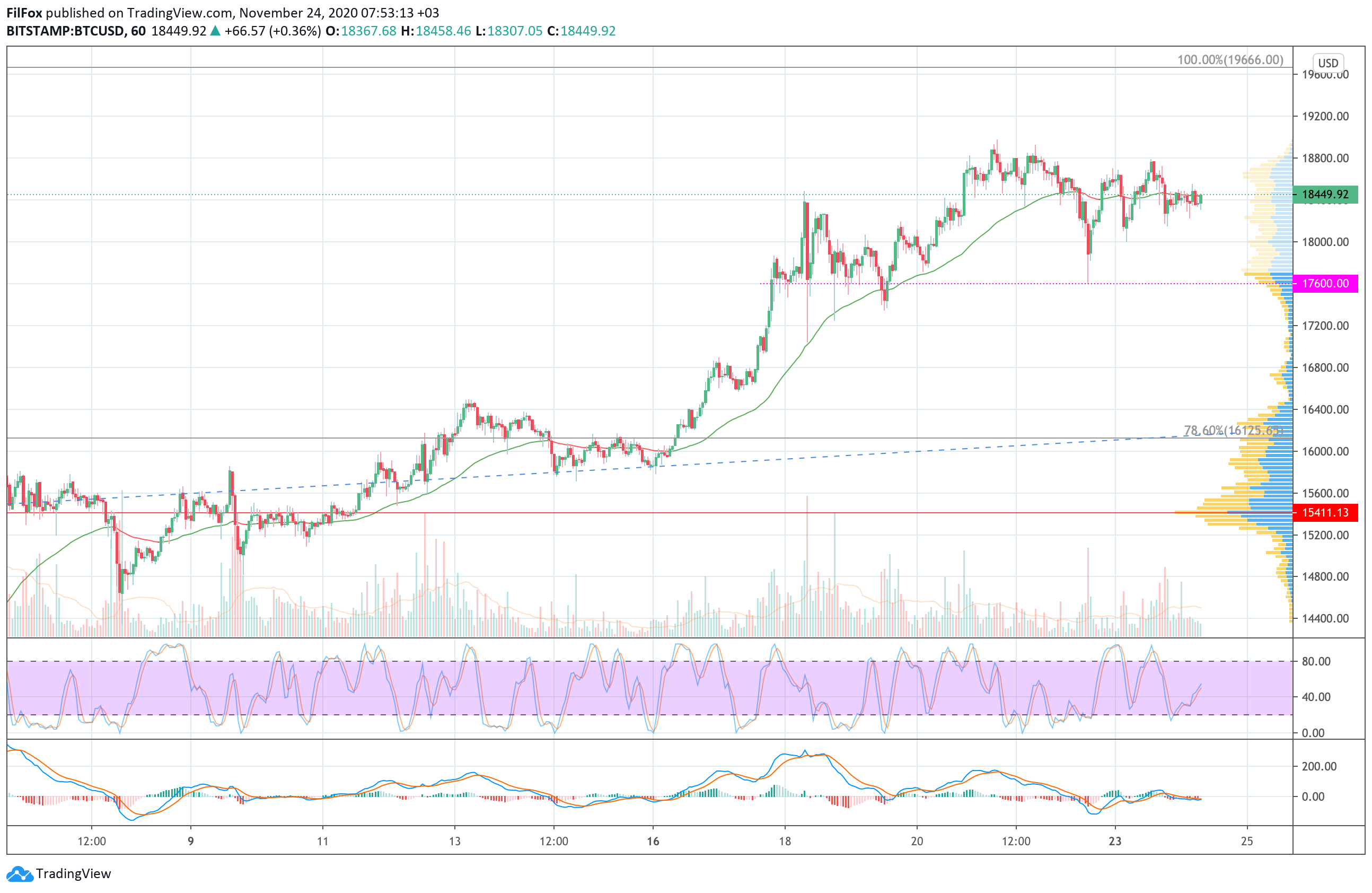Однако, уровень сопротивления 18800.00 USD, по-прежнему, остаётся опасным разворотным рубежом. Если быки смогут его преодолеть, то возможно, до завершения этой недели, мы увидим новый исторический максимум.