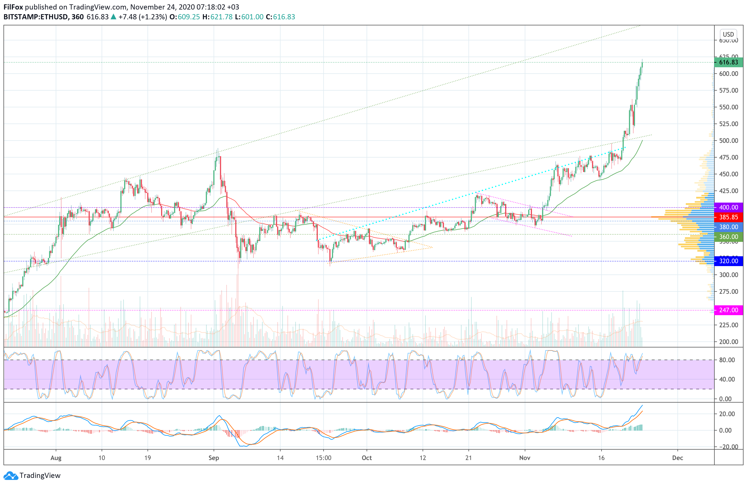 Сегодня ночью покупатели пытались продолжить рост и цена эфира протестировала уровень 620.00 USD, но рост не был поддержан крупными объёмами, поэтому в ближайшее время следует ожидать откат.