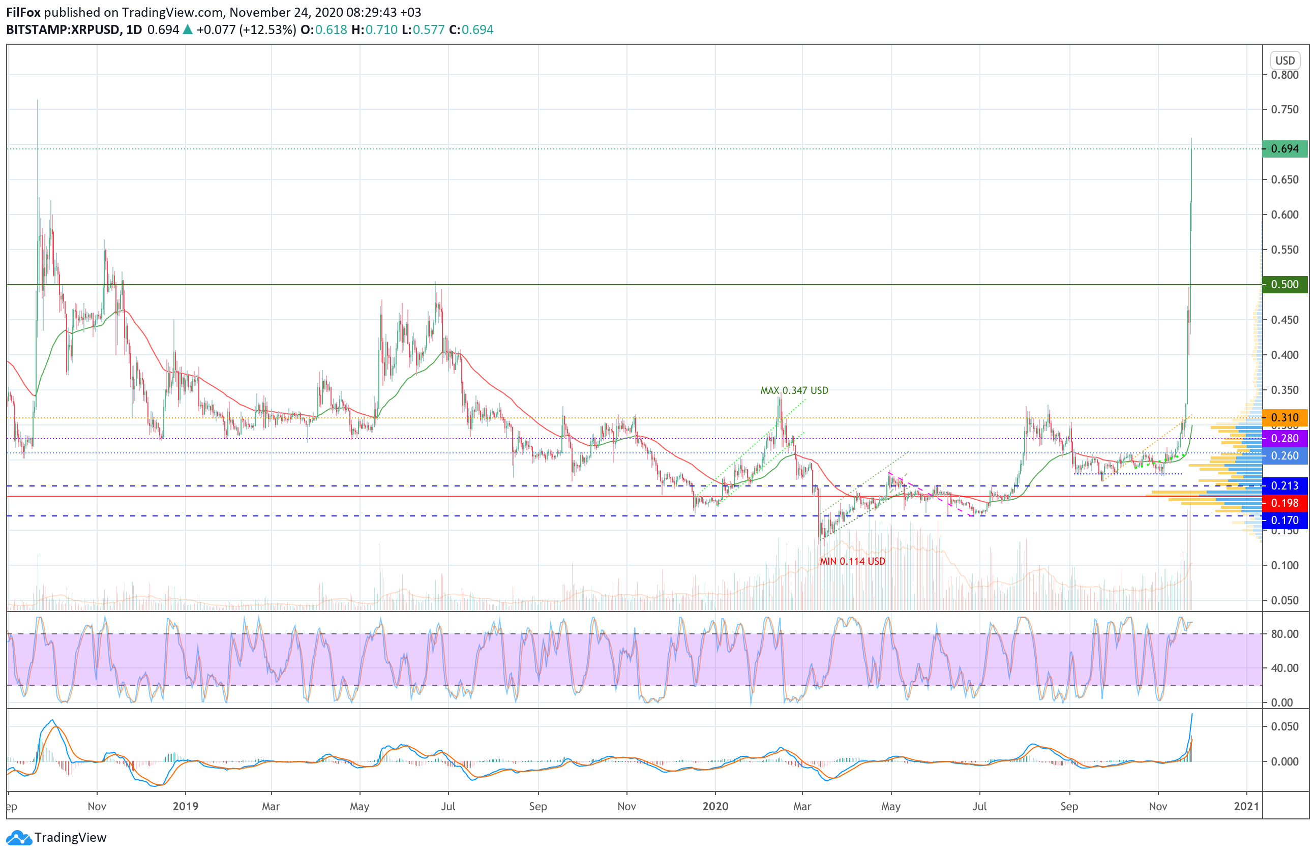 Ближайшее сопротивление, куда быки ещё смогут вытянуть цену Ripple, находится в области 0.750 USD, а поддержка, скорее всего, будет находится на уровне 0.600 USD.