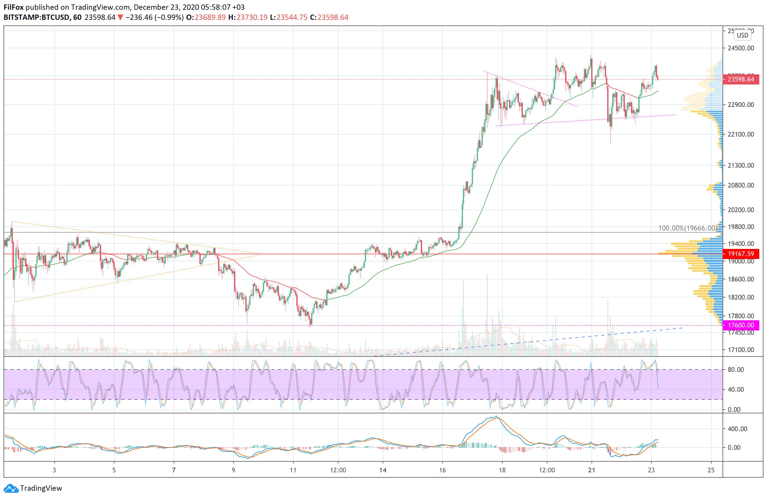 Сегодня ночью цена BTC продолжила восстановление и протестировала уровень 24000.00 USD. Утром наметился небольшой откат. Полагаем, он будет в пределах уровня средних цен, после чего быки попытаются возобновить забег, который на прошлой неделе прервался в районе отметки 24 298.00 USD.