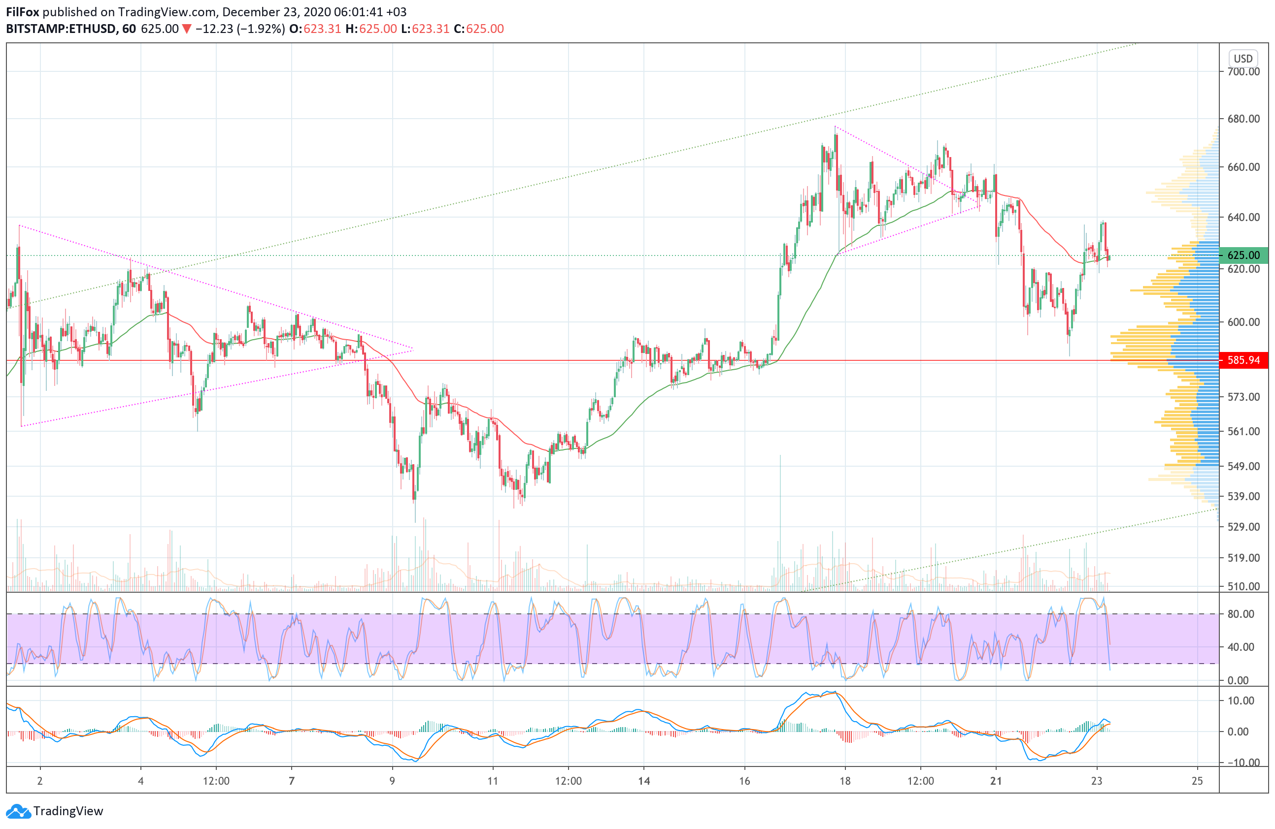 Вчера, в первой половине дня, снижение продолжалось, пока цена Ethereum не протестировала индикаторную линию POC, от которой она отскочила в область скользящей средней EMA55.