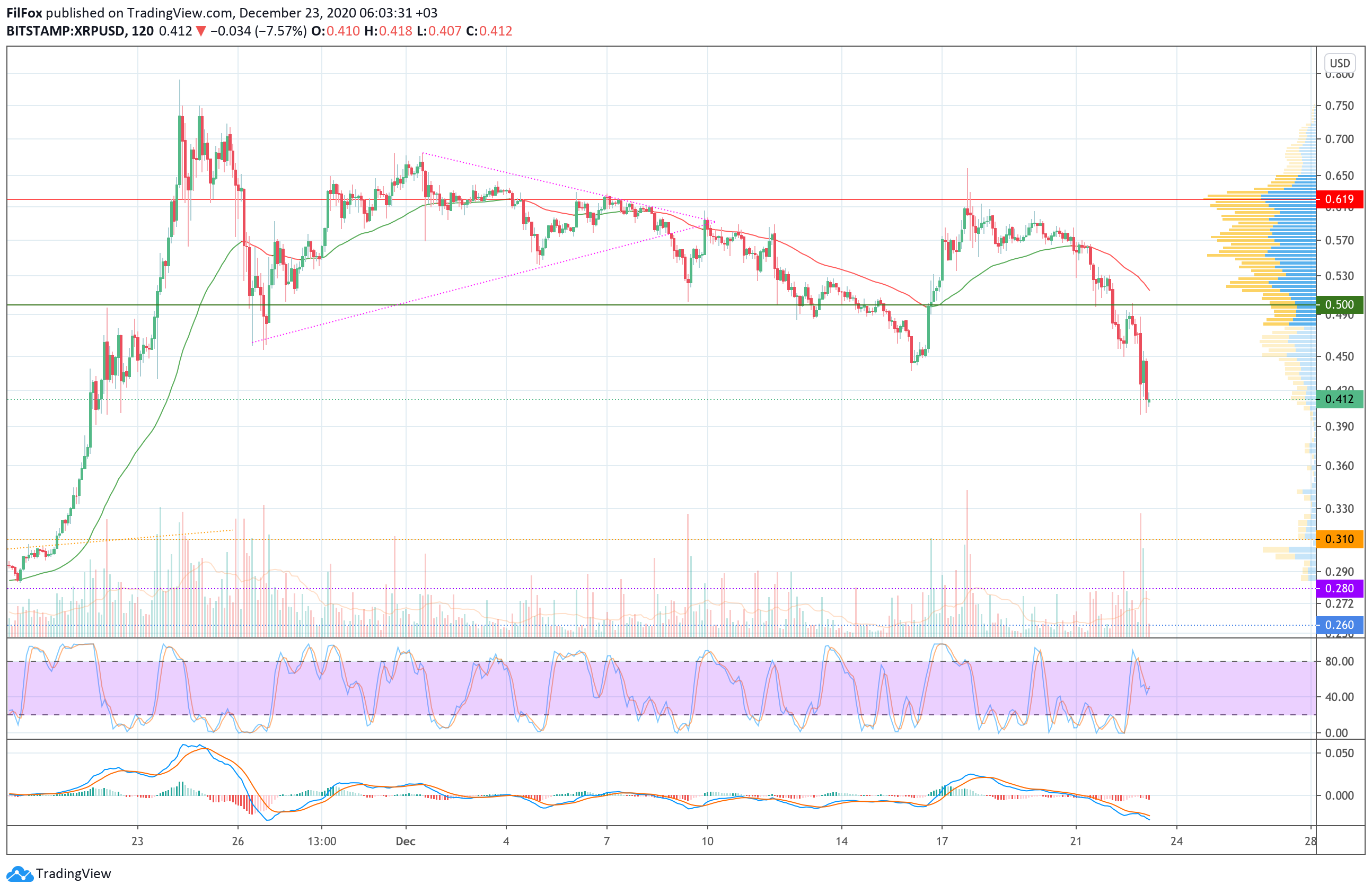 Цена Ripple продолжает демонстрировать негативную динамику. Поддержка на уровне 0.460 USD не смогла остановить снижение в зону декабрьского минимума. В итоге за минувшие сутки пара обновила месячный минимум в точке 0.400 USD.
