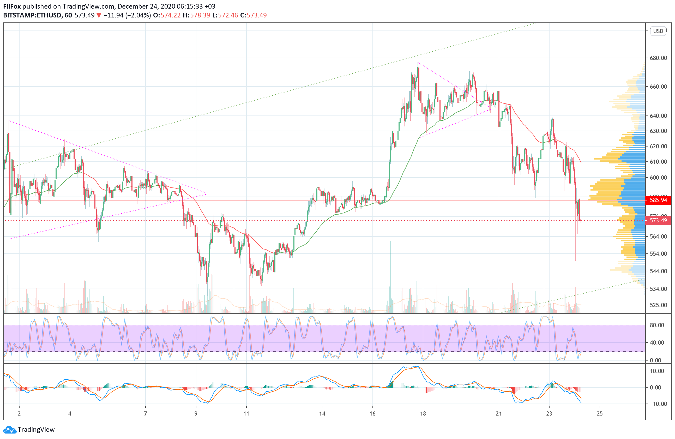 Вчера цена Ethereum не смогла закрепиться в районе часовой EMA55. С самого утра ощущался прессинг со стороны продавцов, которые к обеду оттеснили пару в район отметки 600.00 USD.