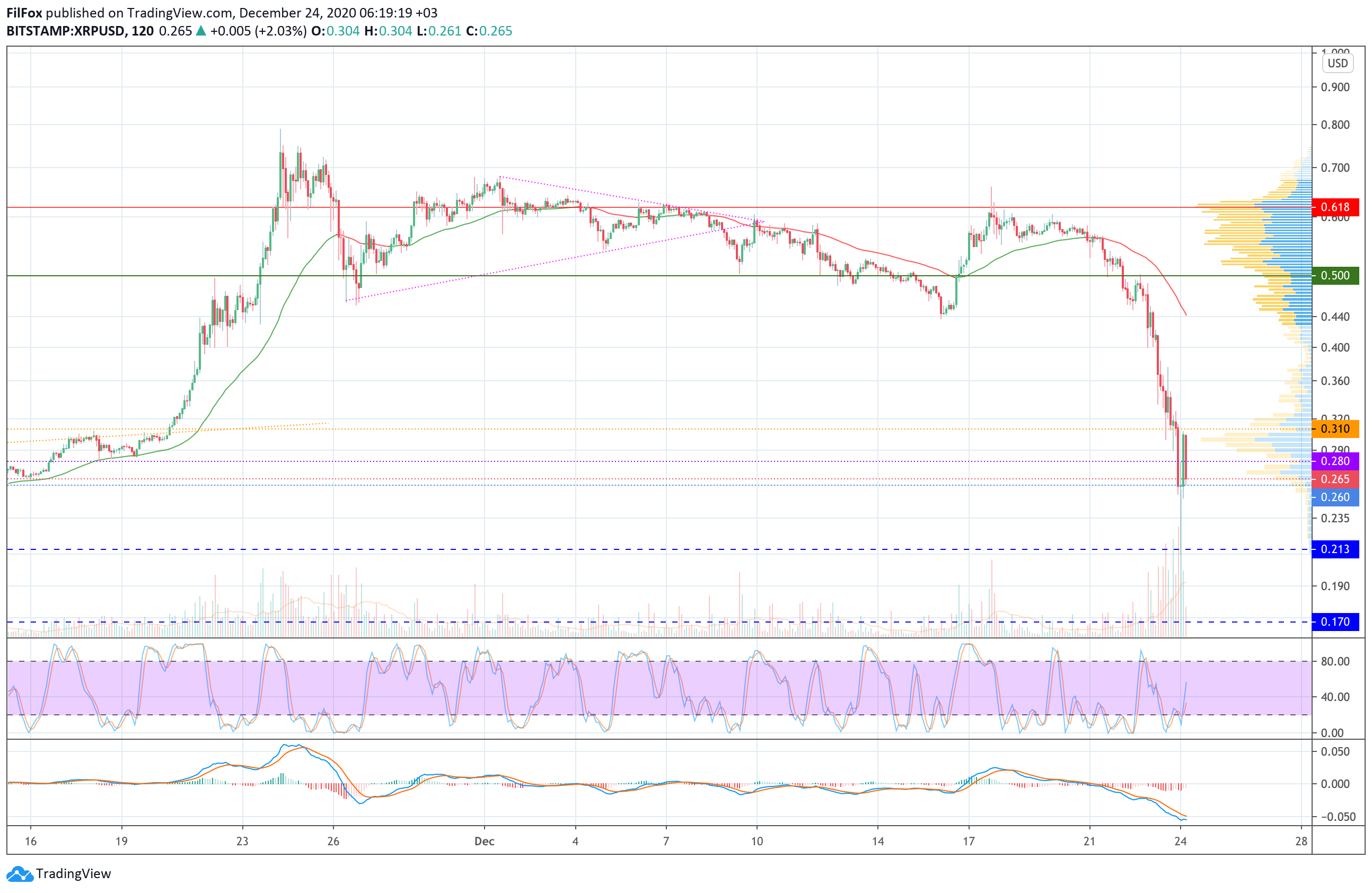 Сегодня ночью цена протестировала уровень 0.213 USD, обозначив декабрьский минимум в точке 0.210 USD. На утро цена отскочила к уровню 0.310 USD, но сегодня этот уровень выступил в качестве сопротивления и цена не смогла продолжить восстановление.