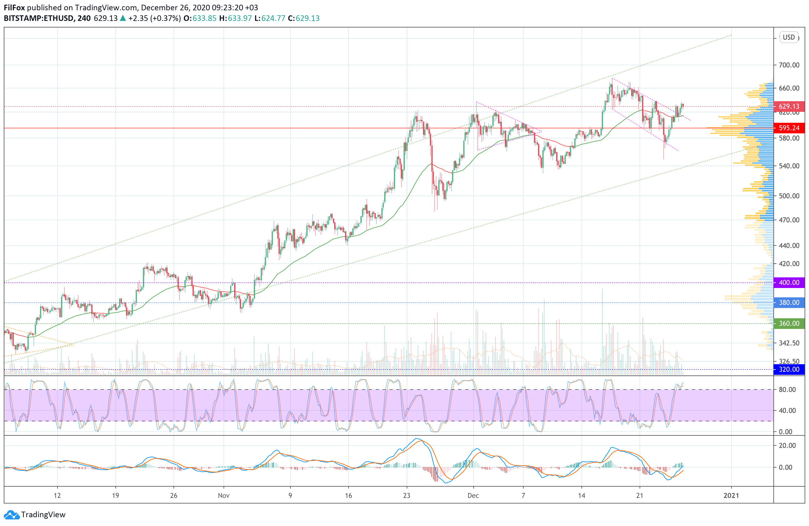 Вчера утром покупатели нарастили объёмы покупок до среднего уровня и попытались пробить верхнюю границу нисходящего фиолетового канала. В течение дня пара протестировала уровень 630.00 USD, но до конца дня вернулась в область четырёхчасовой EMA55.